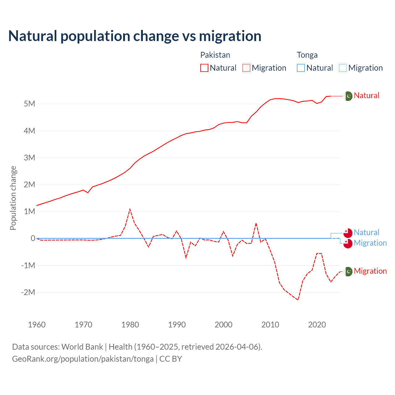 Over the last 10 years, 77.8% of the population change in Pakistan is from natural causes (a gain of 51,255,404 people) and 22.2% is from migration (a loss of 14,629,055 people). In Tonga 46.9% is from natural causes (a gain of 18,919 people) and 53.1% is from migration (a loss of 21,384 people).
