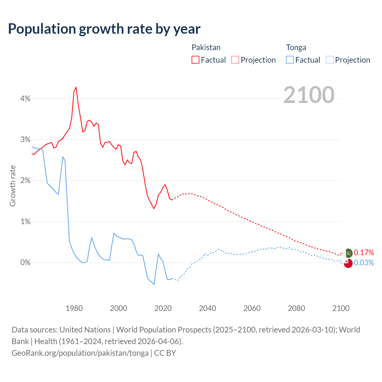 - For the last 10 years, Pakistan has had an average growth rate of +1.6% per year vs -0.25% in Tonga.