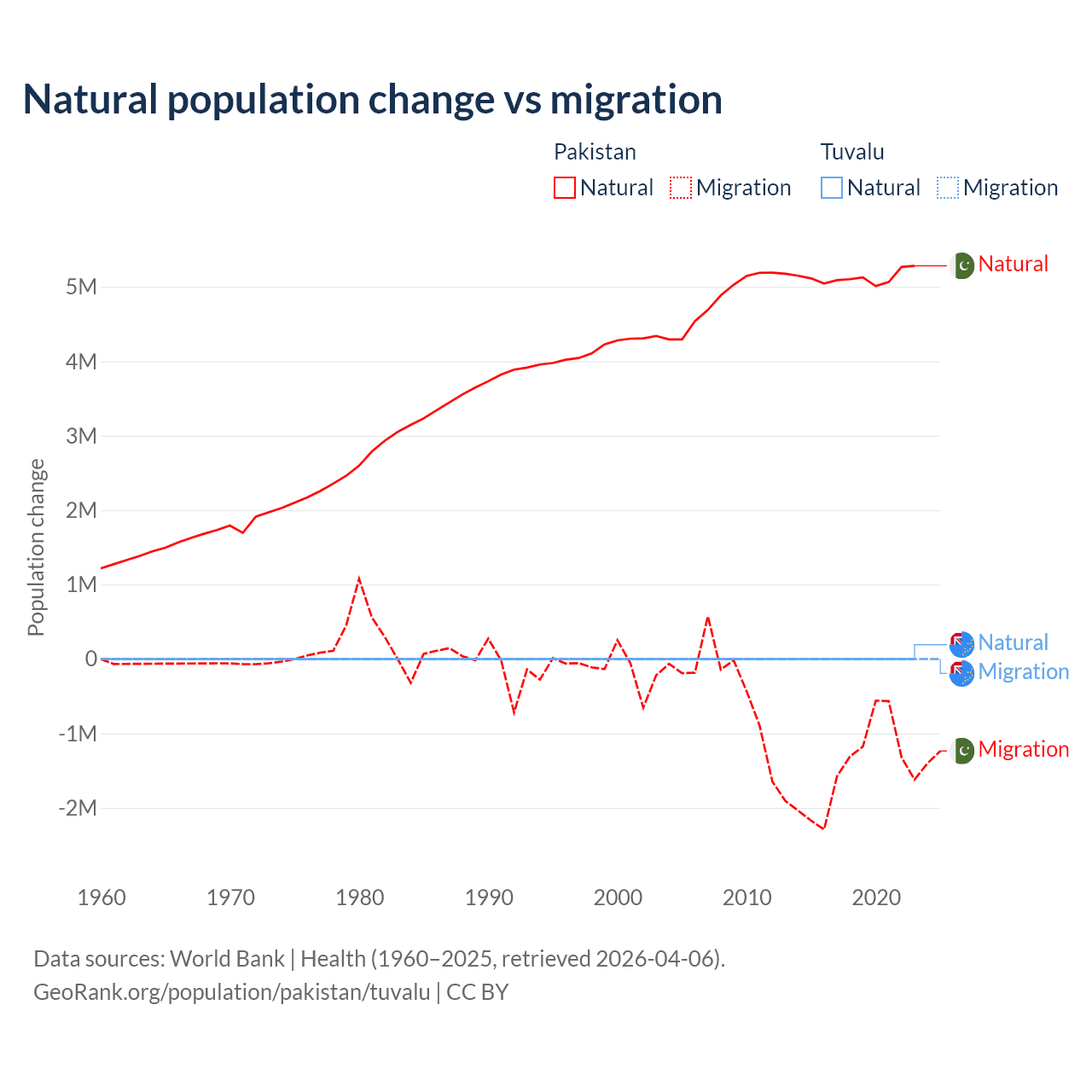 Over the last 10 years, 77.8% of the population change in Pakistan is from natural causes (a gain of 51,255,404 people) and 22.2% is from migration (a loss of 14,629,055 people). In Tuvalu 35.5% is from natural causes (a gain of 1,556 people) and 64.5% is from migration (a loss of 2,827 people).