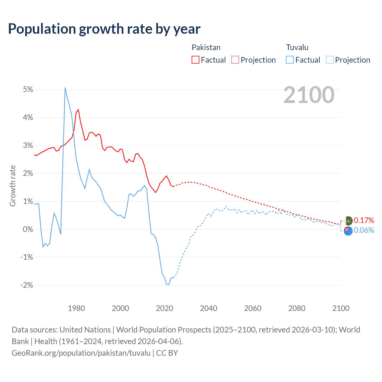 - For the last 10 years, Pakistan has had an average growth rate of +1.6% per year vs -1.19% in Tuvalu.