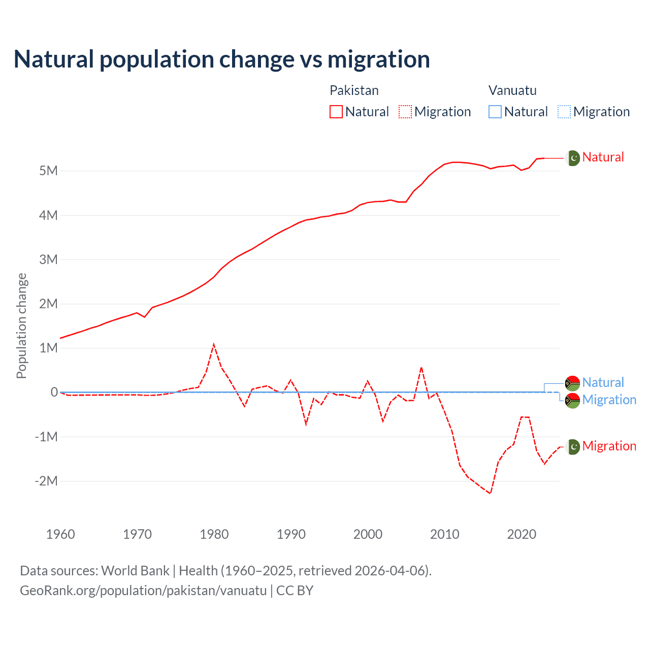 Over the last 10 years, 77.8% of the population change in Pakistan is from natural causes (a gain of 51,255,404 people) and 22.2% is from migration (a loss of 14,629,055 people). In Vanuatu 92.2% is from natural causes (a gain of 72,941 people) and 7.81% is from migration (a loss of 6,181 people).