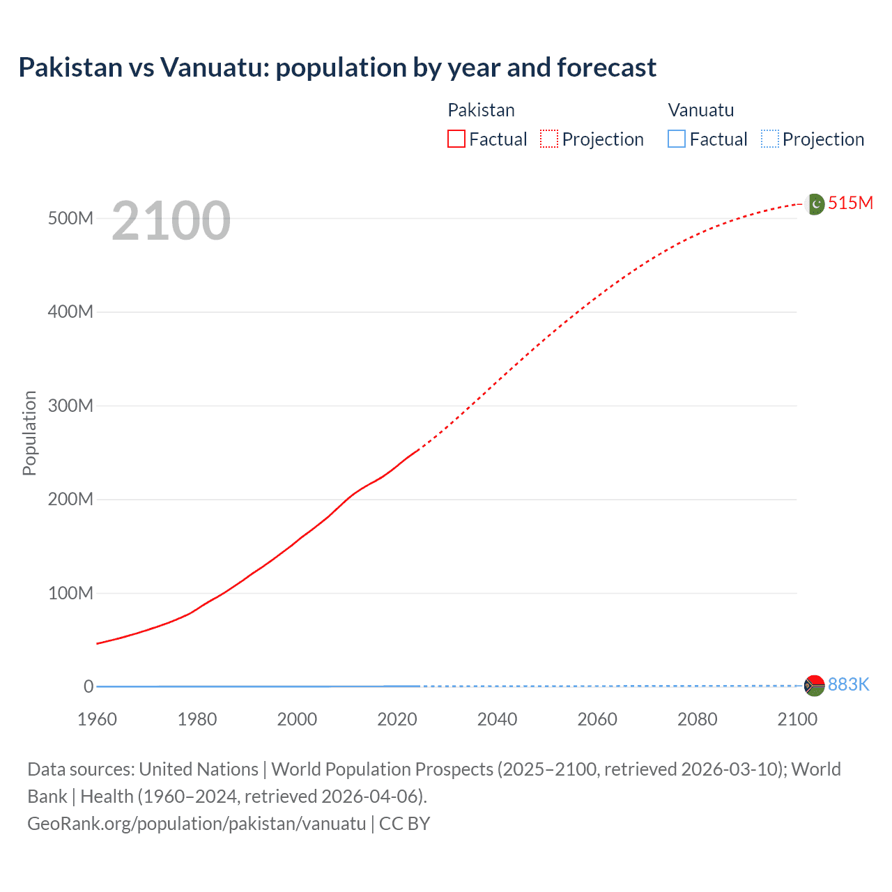 The latest officially reported population of Pakistan was 251,269,164 in 2024 vs 327,777 people in Vanuatu in 2024. In 2026, based on the adjusted UN estimation, the current Pakistan's population is 260,356,147 people compared to 344,750 in Vanuatu.