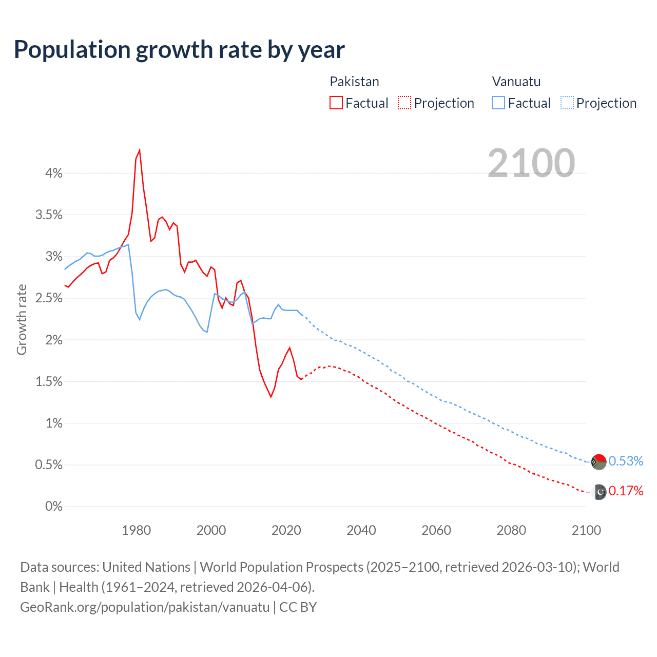 - For the last 10 years, Pakistan has had an average growth rate of +1.6% per year vs +2.33% in Vanuatu.