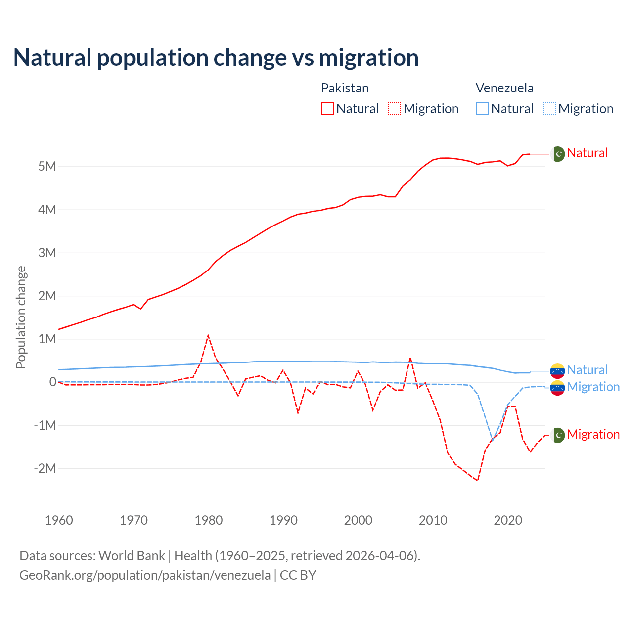 Over the last 10 years, 77.8% of the population change in Pakistan is from natural causes (a gain of 51,255,404 people) and 22.2% is from migration (a loss of 14,629,055 people). In Venezuela 38.6% is from natural causes (a gain of 2,946,257 people) and 61.4% is from migration (a loss of 4,683,227 people).