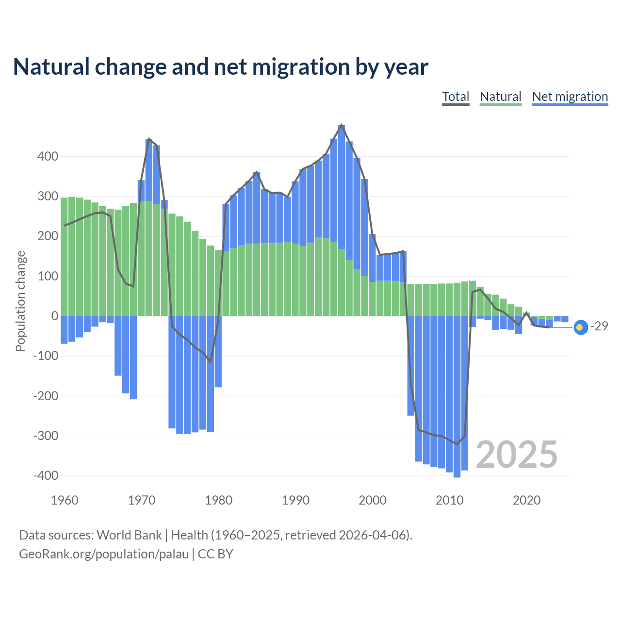 Over the last 10 years, 53.8% of the population change in Palau is from natural causes (a gain of 264 people) and 46.2% is from migration (a loss of 227 people).