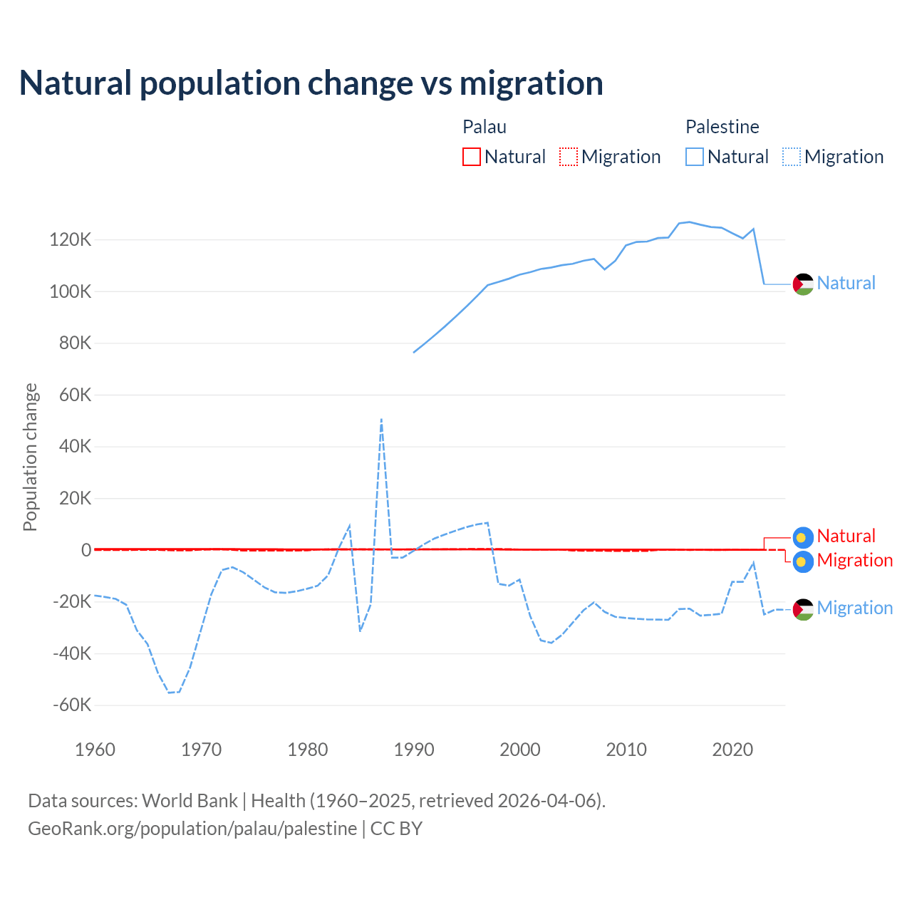 Over the last 10 years, 53.8% of the population change in Palau is from natural causes (a gain of 264 people) and 46.2% is from migration (a loss of 227 people). In Palestine 85.7% is from natural causes (a gain of 1,218,010 people) and 14.3% is from migration (a loss of 202,820 people).
