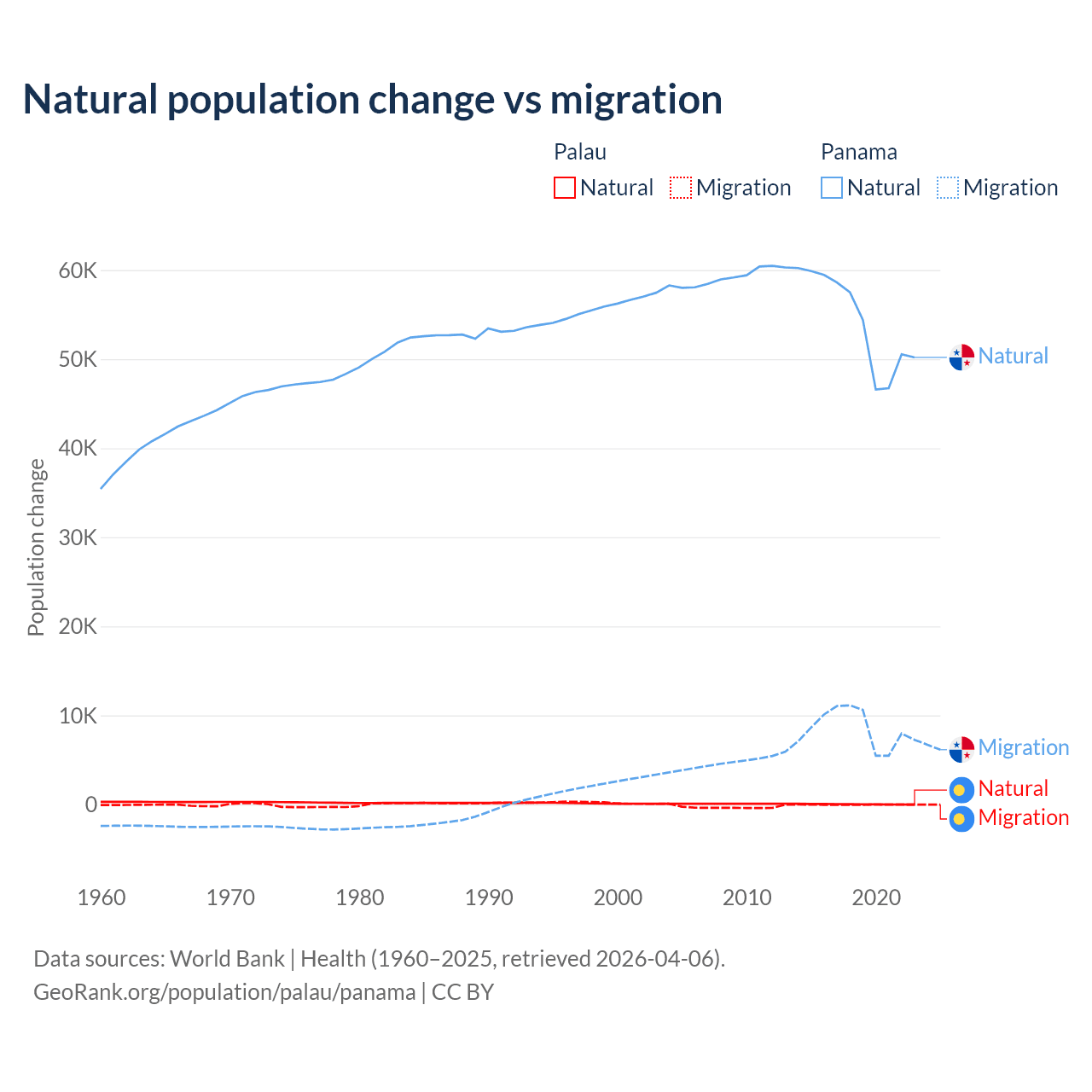 Over the last 10 years, 53.8% of the population change in Palau is from natural causes (a gain of 264 people) and 46.2% is from migration (a loss of 227 people). In Panama 86.5% is from natural causes (a gain of 544,211 people) and 13.5% is from migration (a gain of 84,849 people).