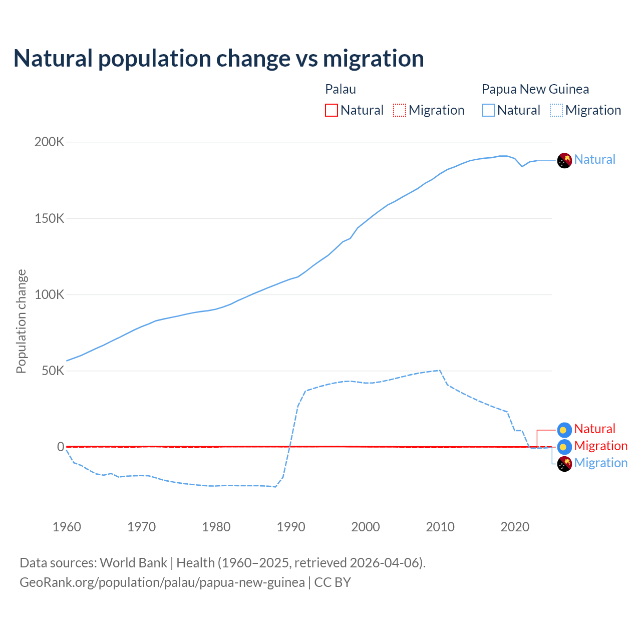 Over the last 10 years, 53.8% of the population change in Palau is from natural causes (a gain of 264 people) and 46.2% is from migration (a loss of 227 people). In Papua New Guinea 91% is from natural causes (a gain of 1,883,906 people) and 8.98% is from migration (a gain of 185,900 people).