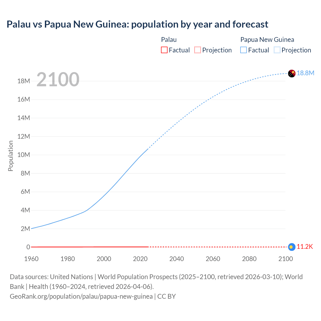 Palau vs Papua New Guinea: population by year and forecast