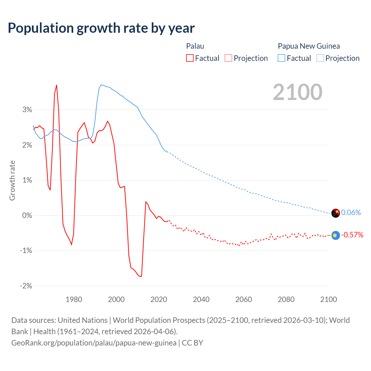 - For the last 10 years, Palau has had an average growth rate of +0.02% per year vs +2.23% in Papua New Guinea.
