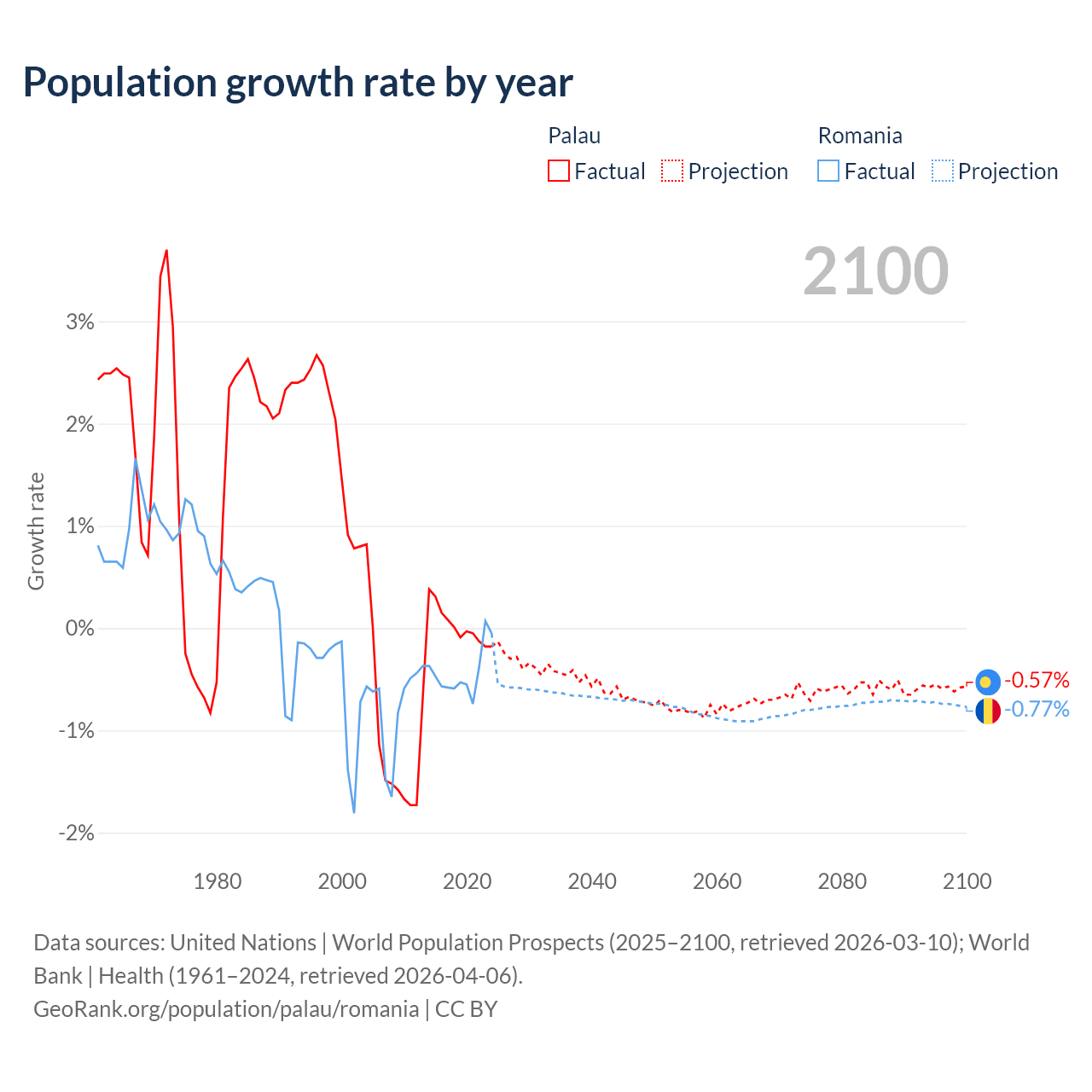 - For the last 10 years, Palau has had an average growth rate of +0.02% per year vs -0.43% in Romania.