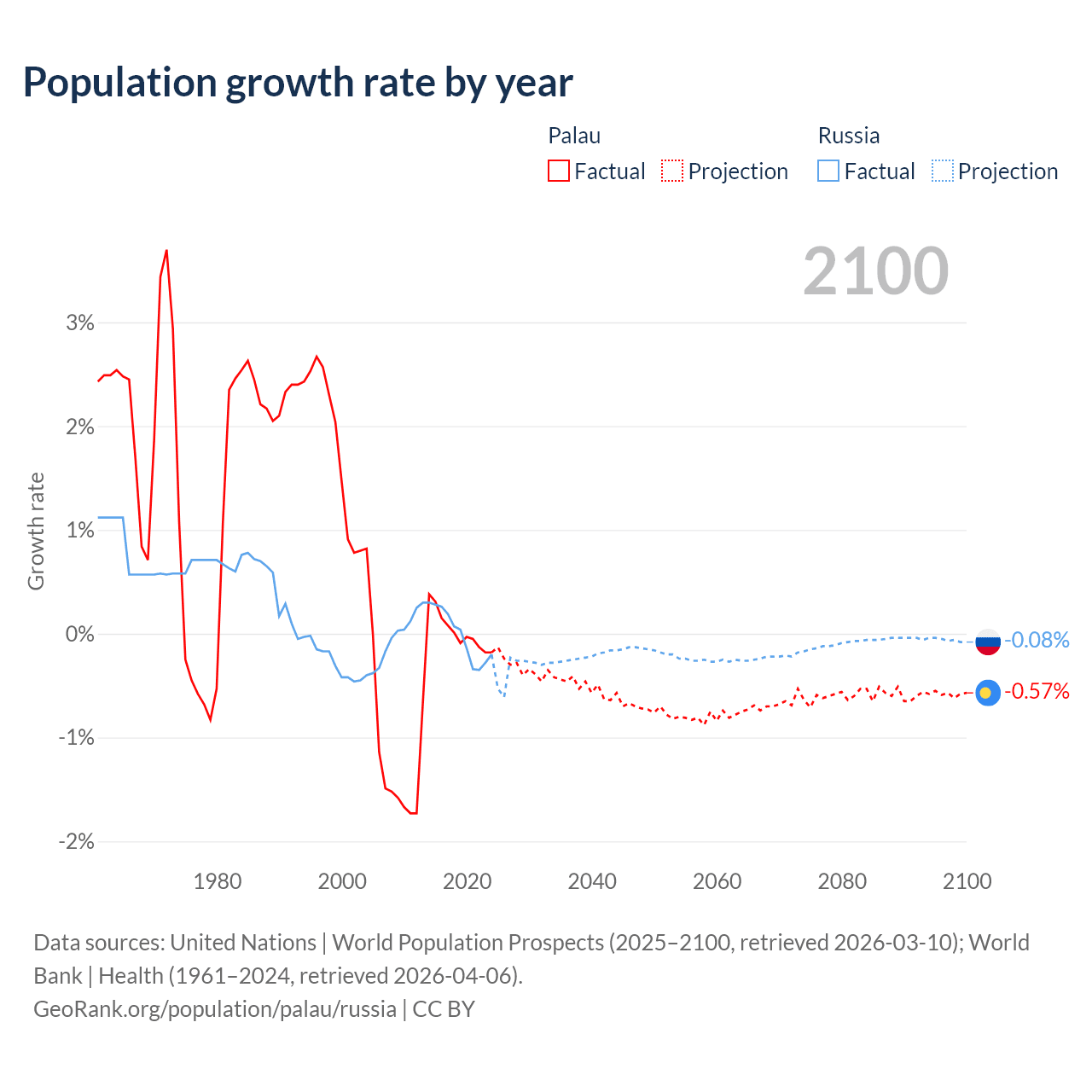 - For the last 10 years, Palau has had an average growth rate of +0.02% per year vs -0.02% in Russia.