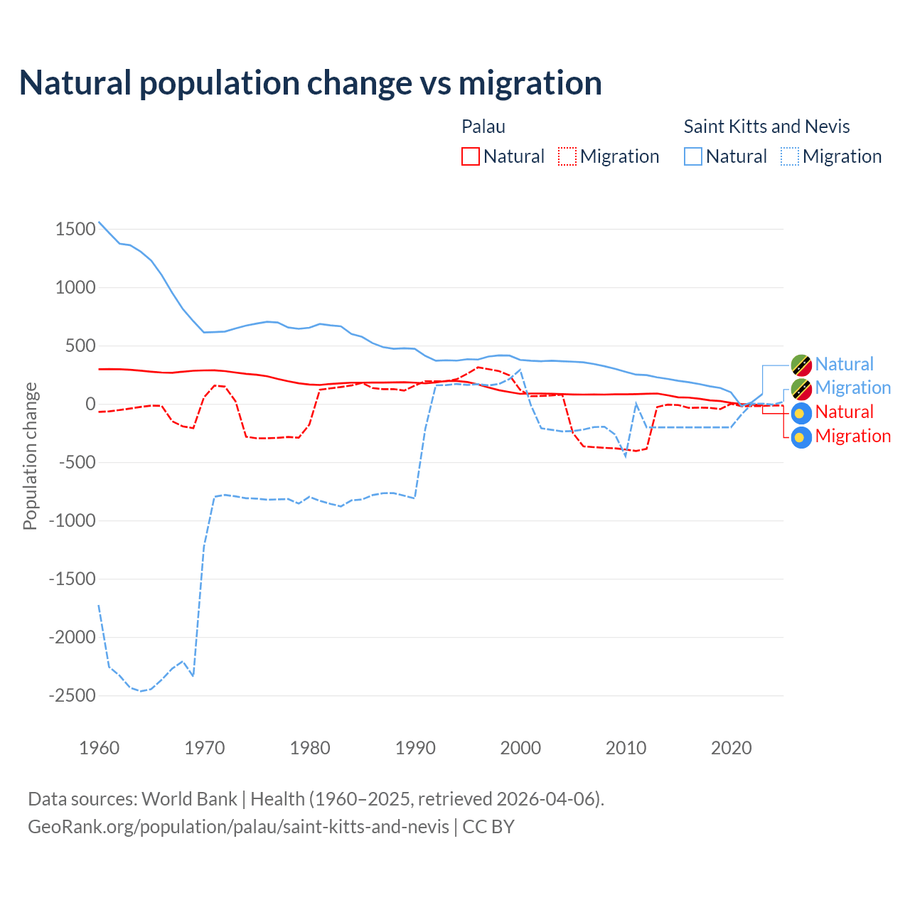 Over the last 10 years, 53.8% of the population change in Palau is from natural causes (a gain of 264 people) and 46.2% is from migration (a loss of 227 people). In Saint Kitts and Nevis 44.9% is from natural causes (a gain of 1,225 people) and 55.1% is from migration (a loss of 1,506 people).