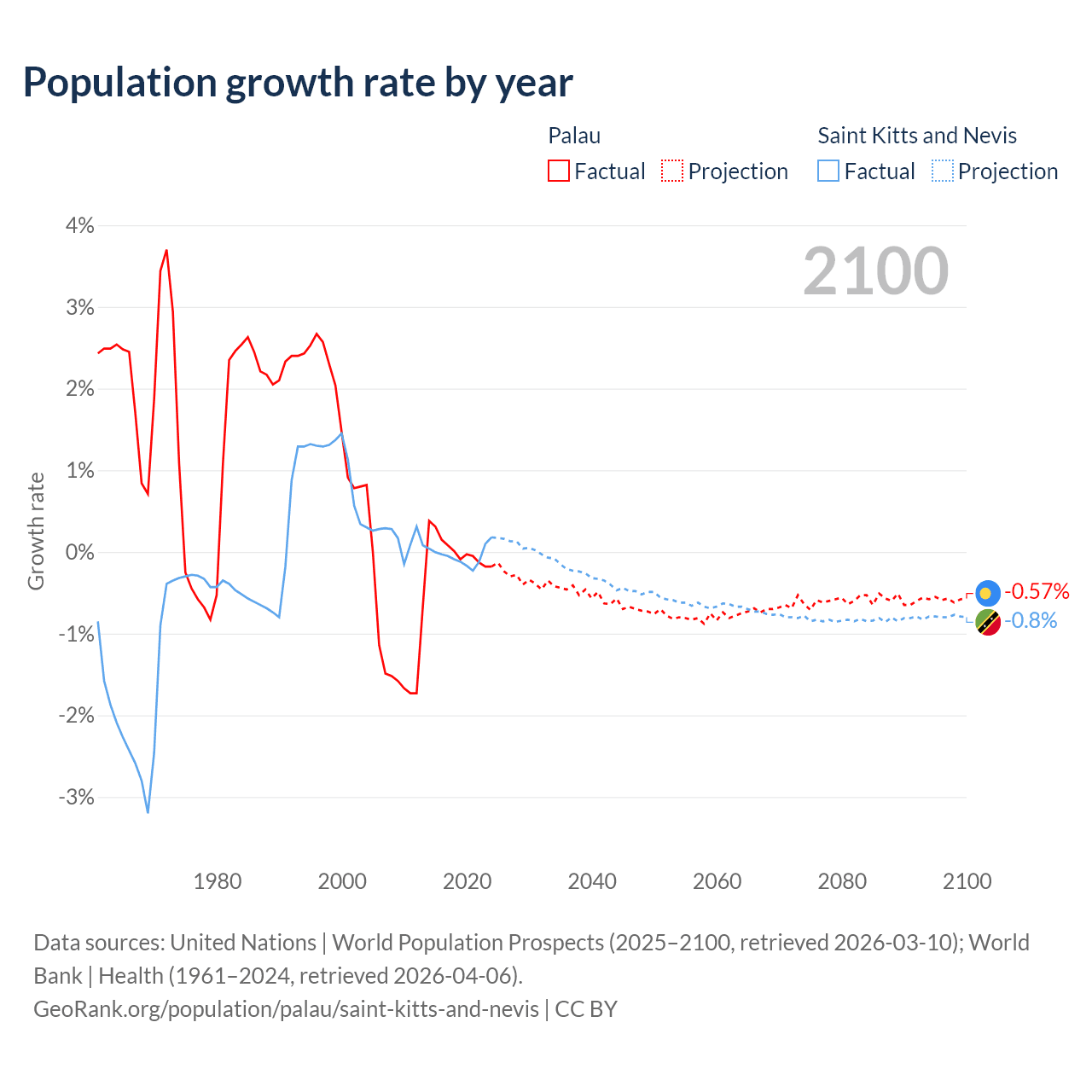 - For the last 10 years, Palau has had an average growth rate of +0.02% per year vs -0.04% in Saint Kitts and Nevis.