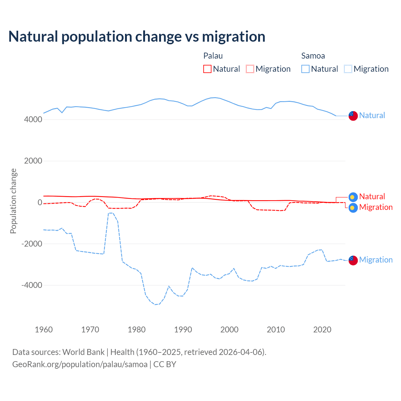 Over the last 10 years, 53.8% of the population change in Palau is from natural causes (a gain of 264 people) and 46.2% is from migration (a loss of 227 people). In Samoa 62.5% is from natural causes (a gain of 45,436 people) and 37.5% is from migration (a loss of 27,246 people).
