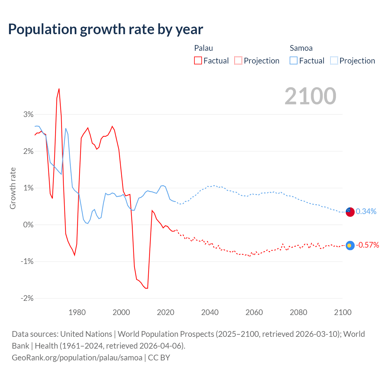 - For the last 10 years, Palau has had an average growth rate of +0.02% per year vs +0.87% in Samoa.