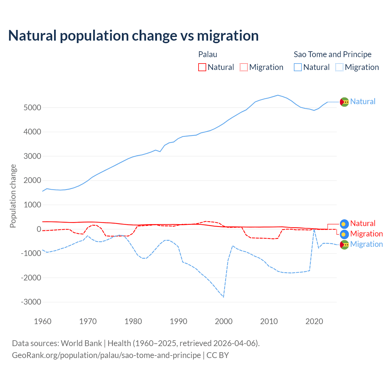 Over the last 10 years, 53.8% of the population change in Palau is from natural causes (a gain of 264 people) and 46.2% is from migration (a loss of 227 people). In Sao Tome and Principe 80.1% is from natural causes (a gain of 50,822 people) and 19.9% is from migration (a loss of 12,621 people).