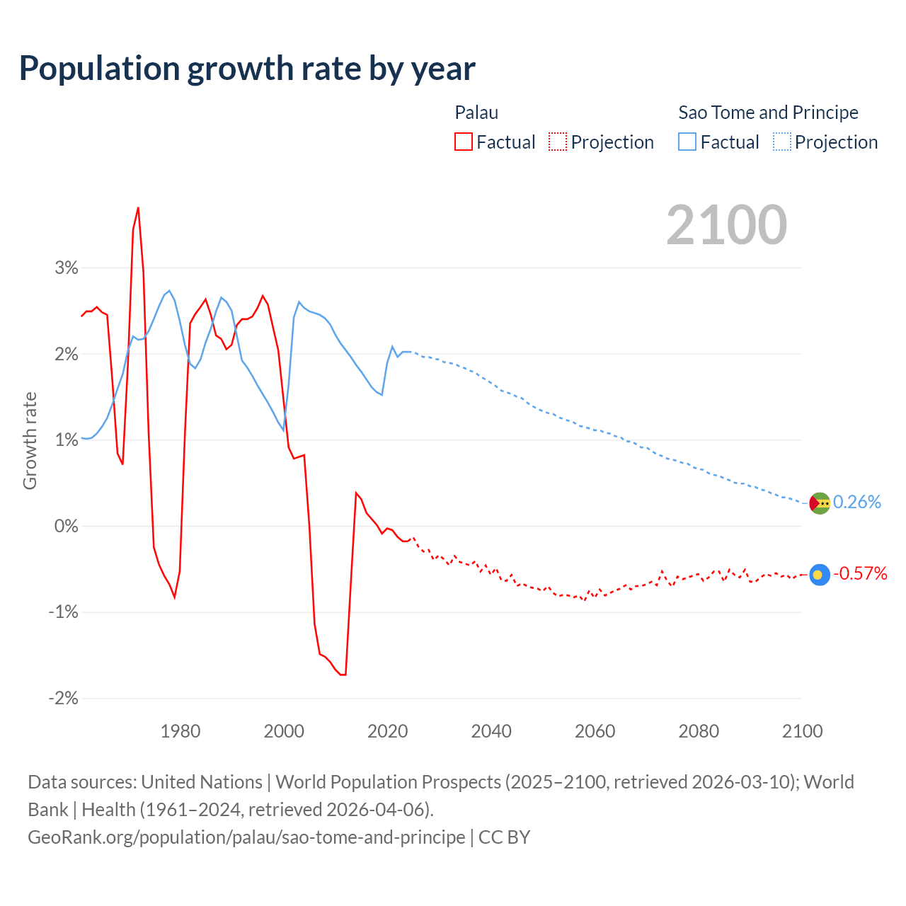 - For the last 10 years, Palau has had an average growth rate of +0.02% per year vs +1.82% in Sao Tome and Principe.