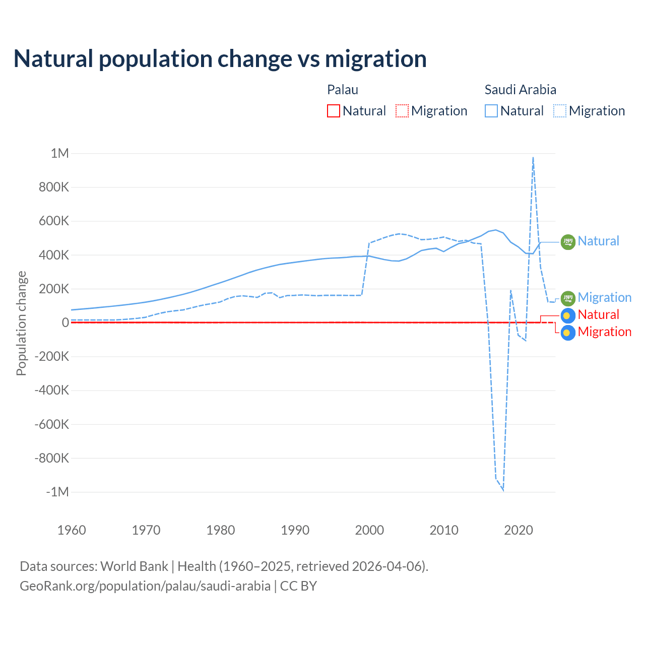 Over the last 10 years, 53.8% of the population change in Palau is from natural causes (a gain of 264 people) and 46.2% is from migration (a loss of 227 people). In Saudi Arabia 93.9% is from natural causes (a gain of 4,829,562 people) and 6.05% is from migration (a gain of 311,209 people).
