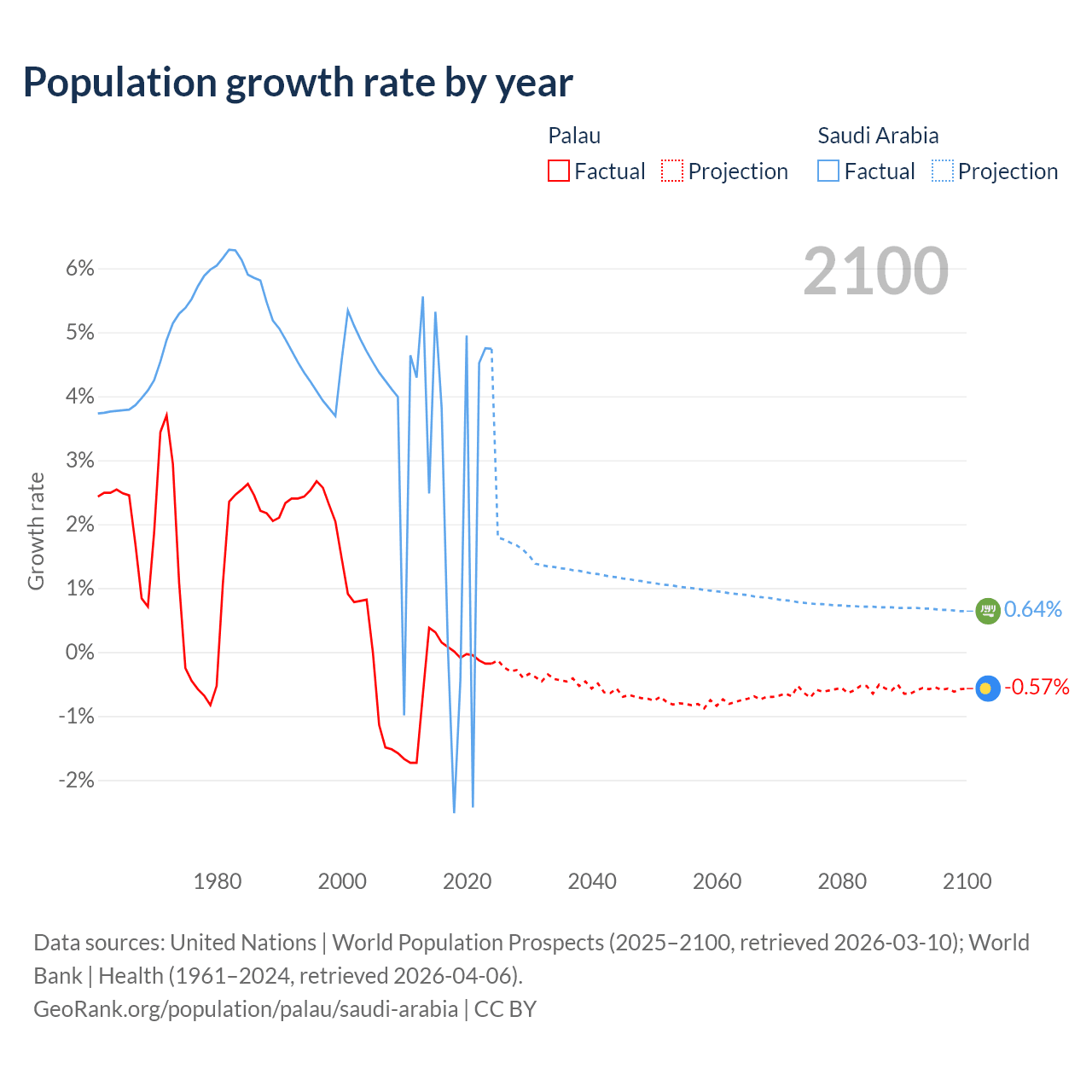 - For the last 10 years, Palau has had an average growth rate of +0.02% per year vs +2.3% in Saudi Arabia.