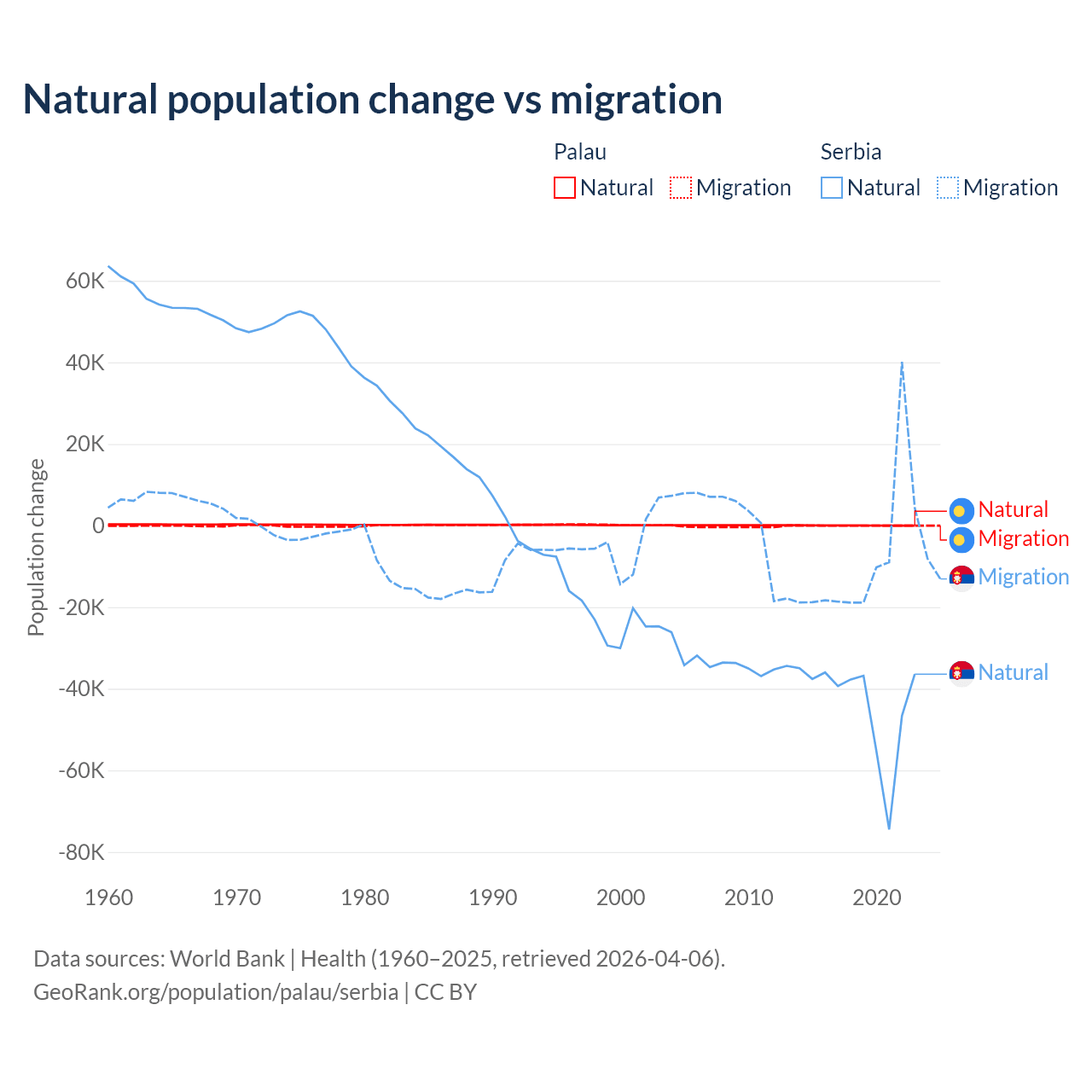 Over the last 10 years, 53.8% of the population change in Palau is from natural causes (a gain of 264 people) and 46.2% is from migration (a loss of 227 people). In Serbia 83.3% is from natural causes (a loss of 435,148 people) and 16.7% is from migration (a loss of 87,110 people).