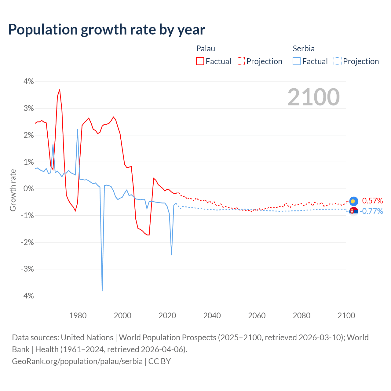 - For the last 10 years, Palau has had an average growth rate of +0.02% per year vs -0.76% in Serbia.