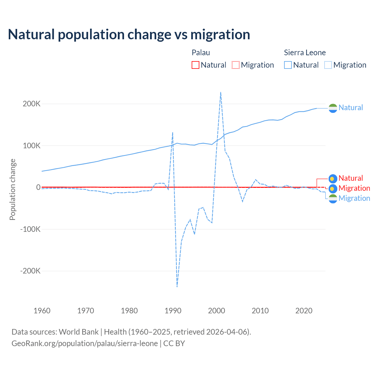 Over the last 10 years, 53.8% of the population change in Palau is from natural causes (a gain of 264 people) and 46.2% is from migration (a loss of 227 people). In Sierra Leone 99.6% is from natural causes (a gain of 1,764,049 people) and 0.41% is from migration (a loss of 7,211 people).