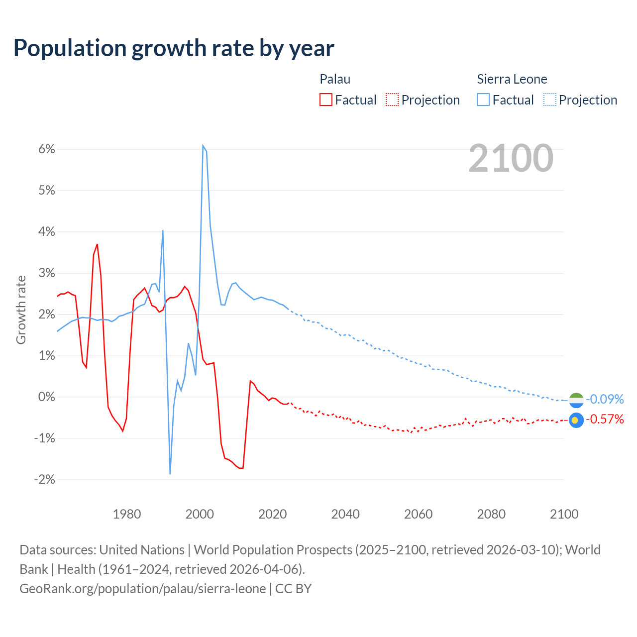 - For the last 10 years, Palau has had an average growth rate of +0.02% per year vs +2.32% in Sierra Leone.