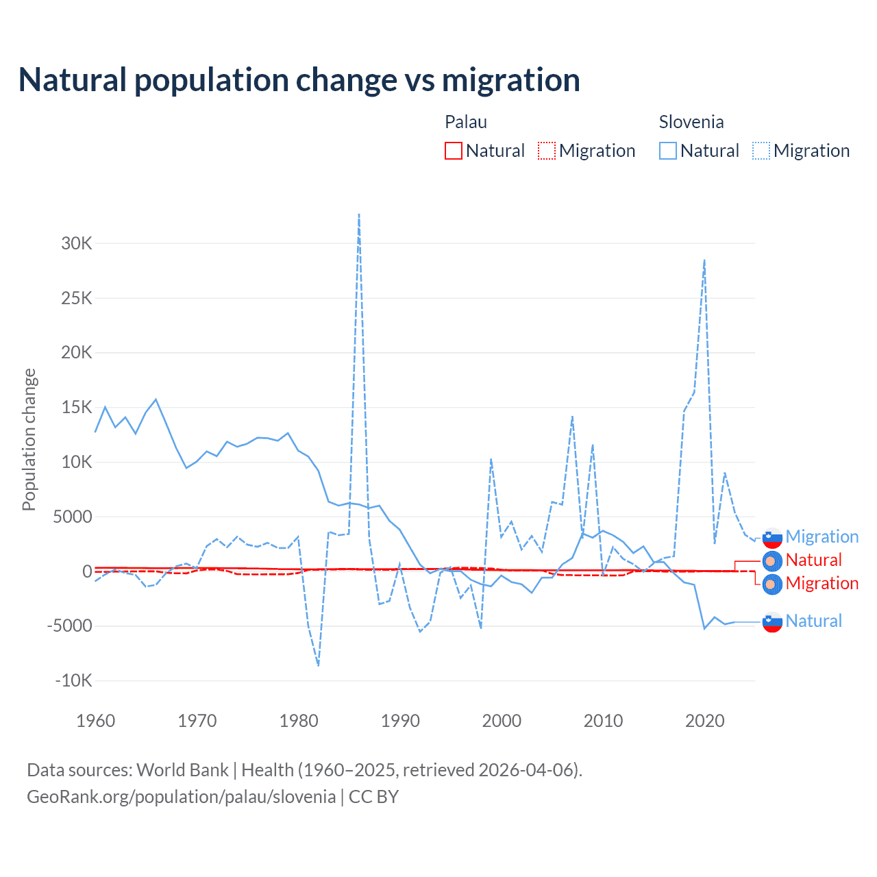 Over the last 10 years, 53.8% of the population change in Palau is from natural causes (a gain of 264 people) and 46.2% is from migration (a loss of 227 people). In Slovenia 18.1% is from natural causes (a loss of 17,573 people) and 81.9% is from migration (a gain of 79,532 people).