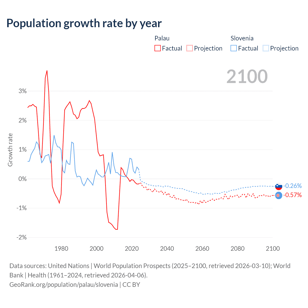 - For the last 10 years, Palau has had an average growth rate of +0.02% per year vs +0.29% in Slovenia.