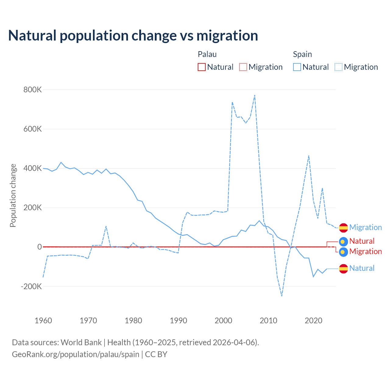 Over the last 10 years, 53.8% of the population change in Palau is from natural causes (a gain of 264 people) and 46.2% is from migration (a loss of 227 people). In Spain 25.8% is from natural causes (a loss of 627,829 people) and 74.2% is from migration (a gain of 1,810,127 people).