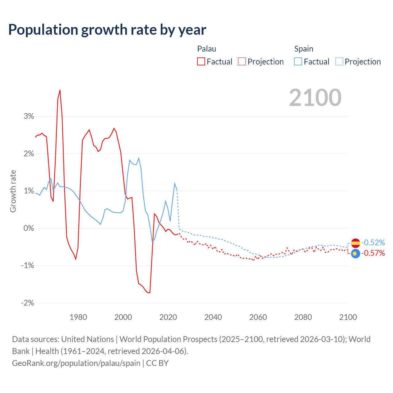 Palau vs Spain: population by year and forecast