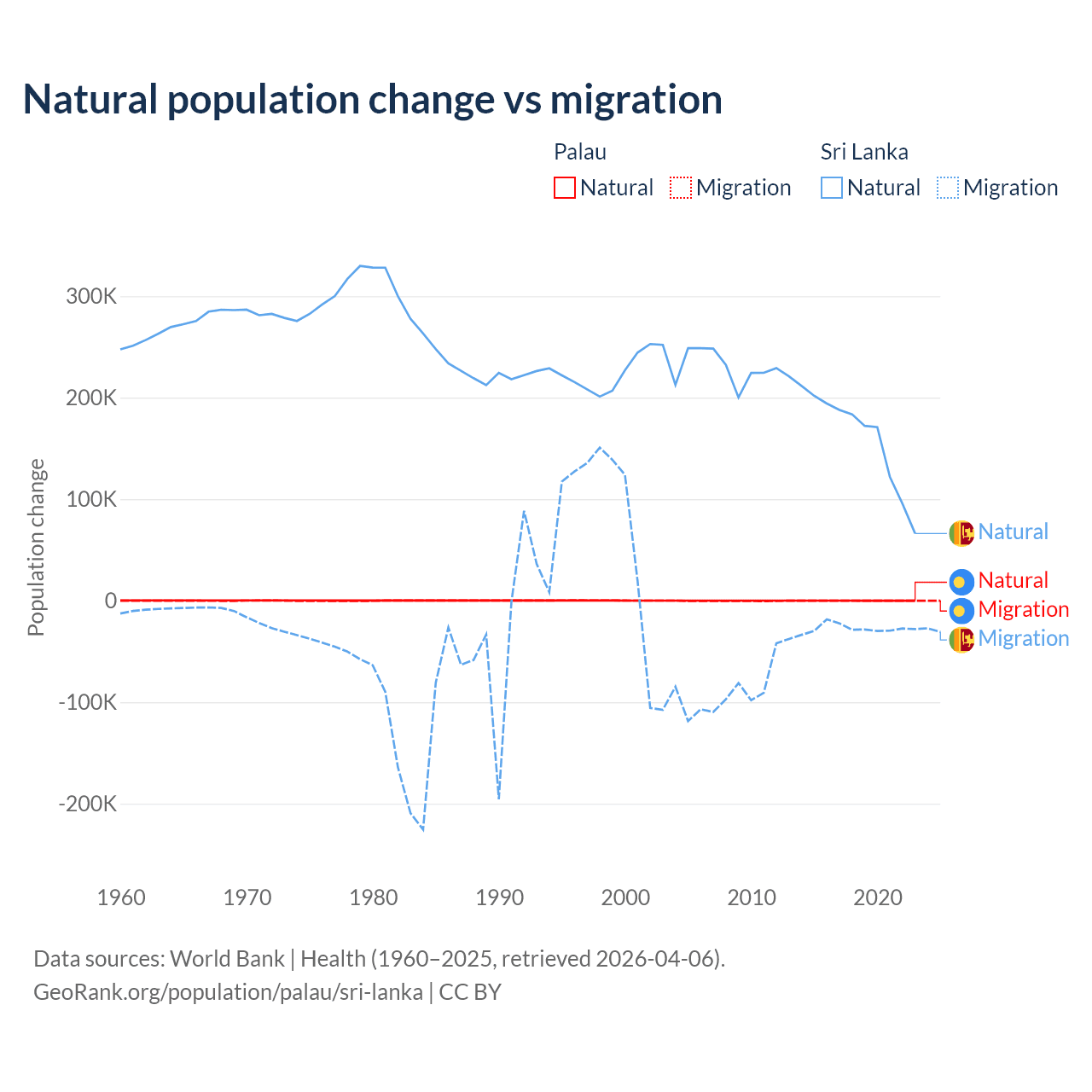 Over the last 10 years, 53.8% of the population change in Palau is from natural causes (a gain of 264 people) and 46.2% is from migration (a loss of 227 people). In Sri Lanka 85.3% is from natural causes (a gain of 1,605,749 people) and 14.7% is from migration (a loss of 276,121 people).