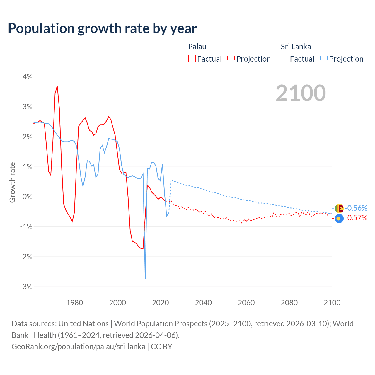 - For the last 10 years, Palau has had an average growth rate of +0.02% per year vs +0.57% in Sri Lanka.