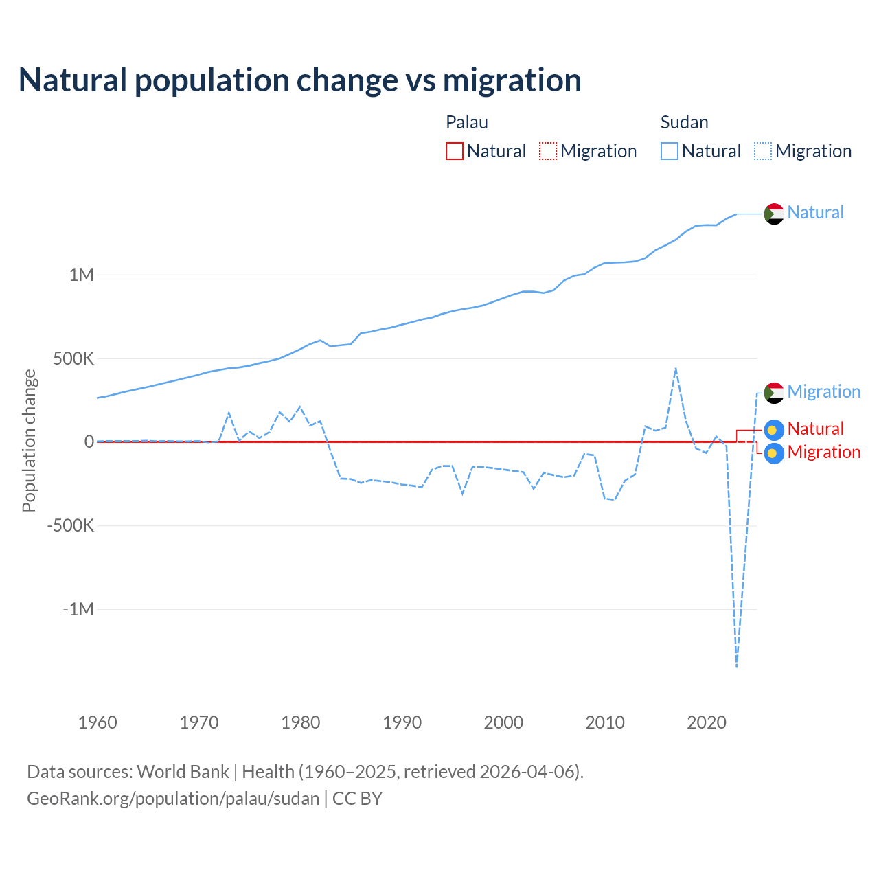 Over the last 10 years, 53.8% of the population change in Palau is from natural causes (a gain of 264 people) and 46.2% is from migration (a loss of 227 people). In Sudan 95.1% is from natural causes (a gain of 12,459,977 people) and 4.88% is from migration (a loss of 639,596 people).