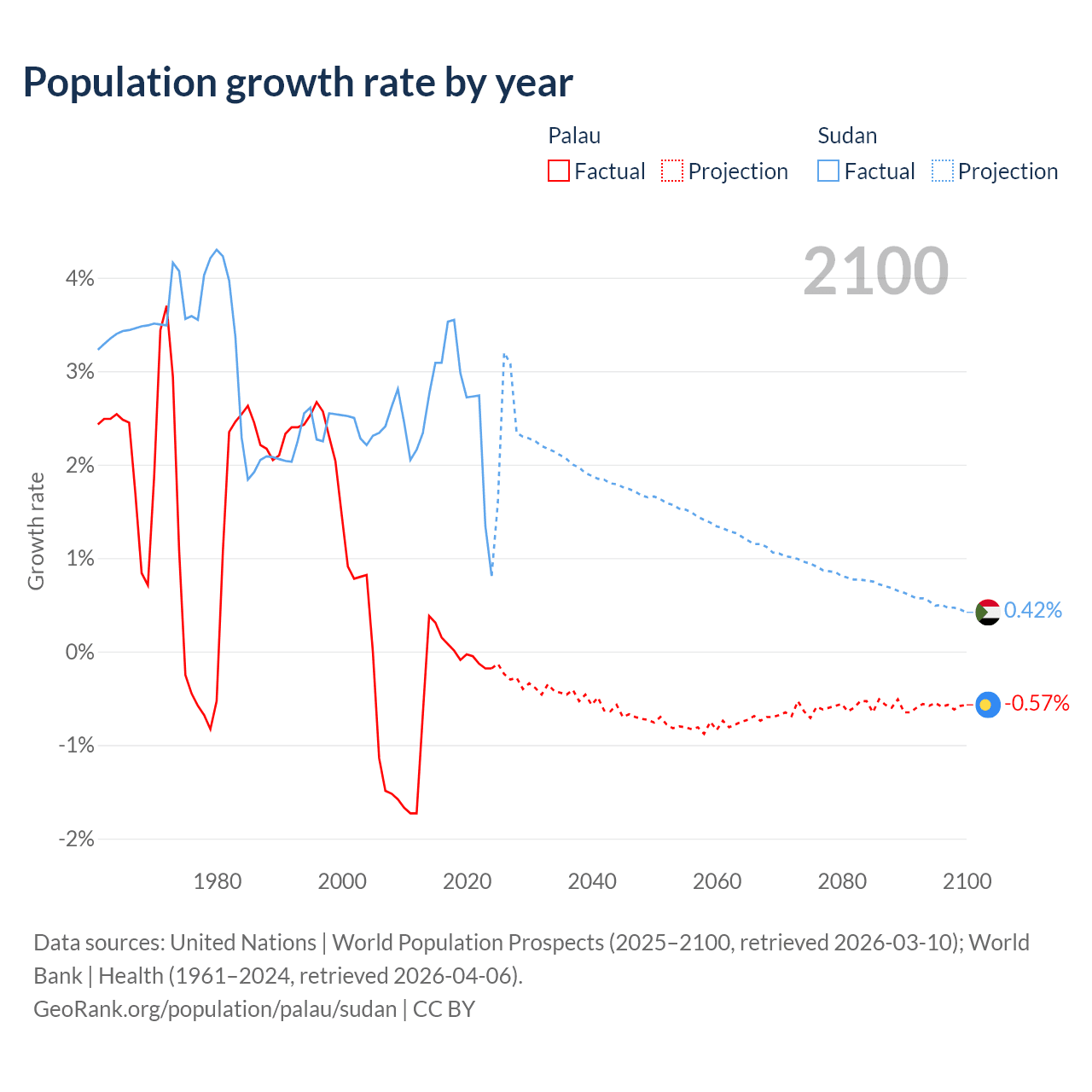 - For the last 10 years, Palau has had an average growth rate of +0.02% per year vs +2.67% in Sudan.