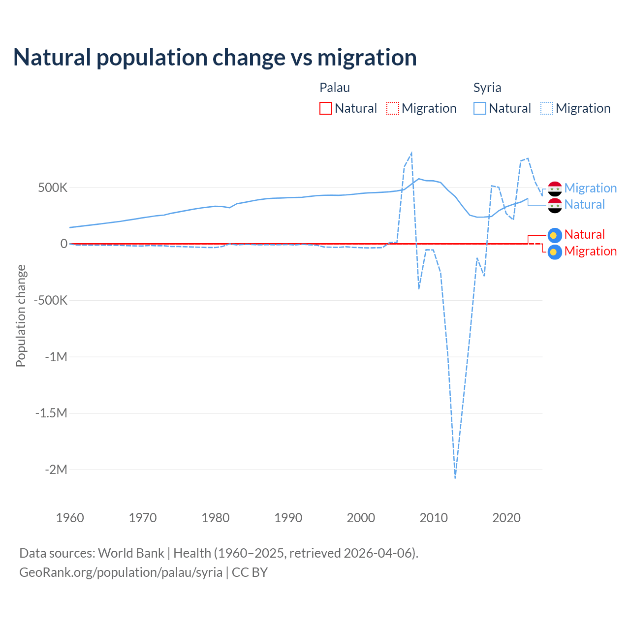 Over the last 10 years, 53.8% of the population change in Palau is from natural causes (a gain of 264 people) and 46.2% is from migration (a loss of 227 people). In Syria 91.3% is from natural causes (a gain of 3,047,621 people) and 8.72% is from migration (a gain of 291,069 people).