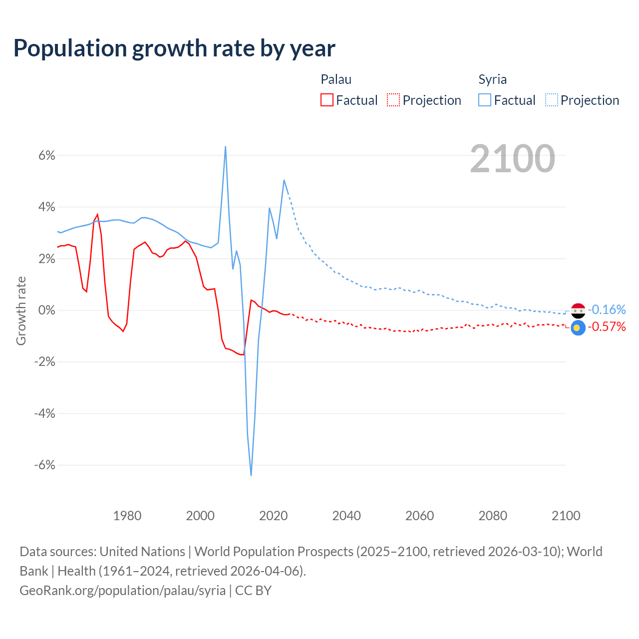 - For the last 10 years, Palau has had an average growth rate of +0.02% per year vs +1.25% in Syria.