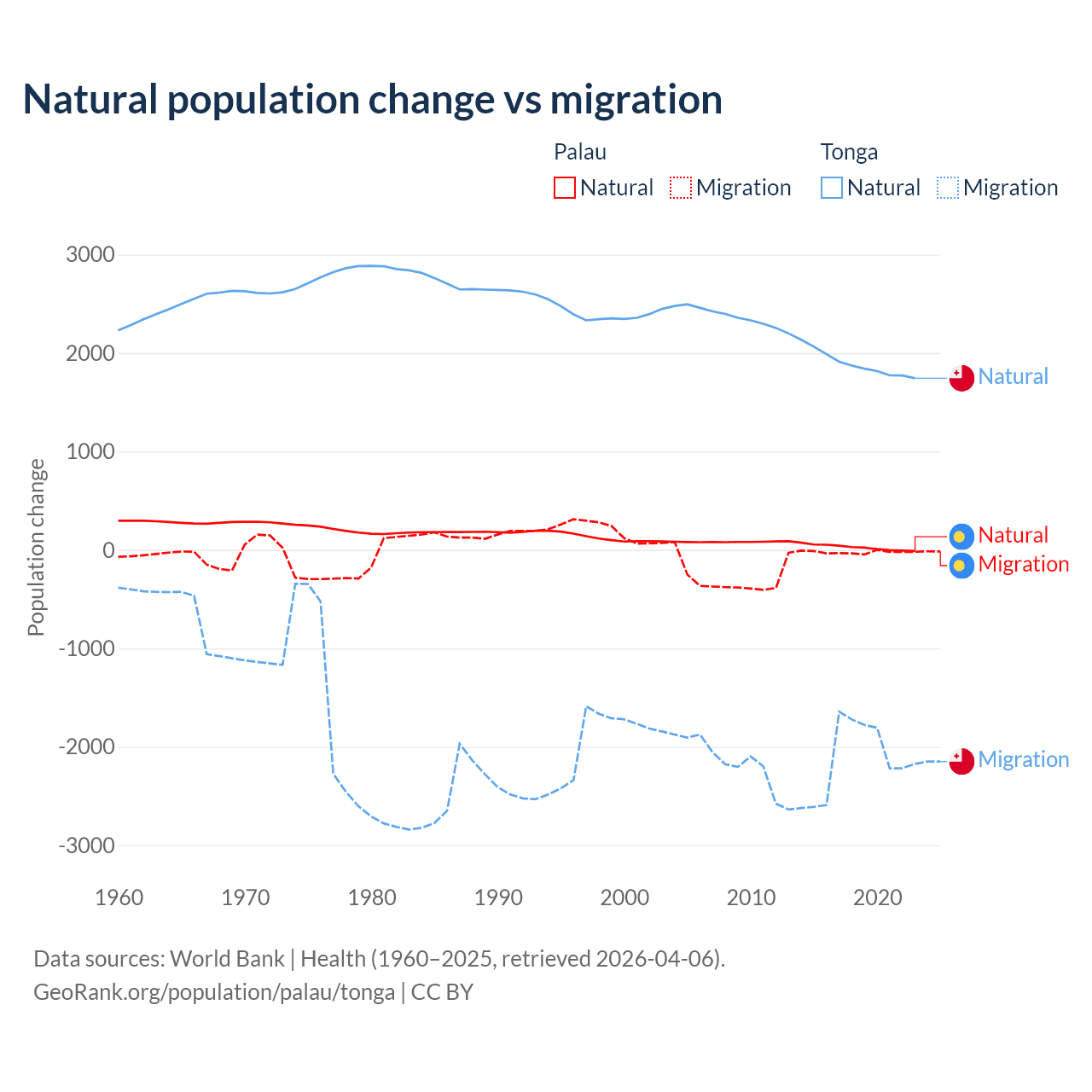 Over the last 10 years, 53.8% of the population change in Palau is from natural causes (a gain of 264 people) and 46.2% is from migration (a loss of 227 people). In Tonga 46.9% is from natural causes (a gain of 18,919 people) and 53.1% is from migration (a loss of 21,384 people).