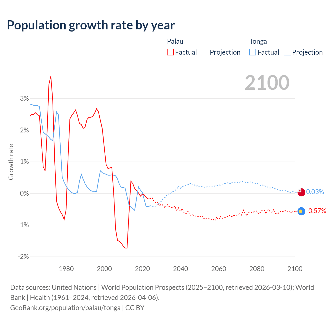 - For the last 10 years, Palau has had an average growth rate of +0.02% per year vs -0.25% in Tonga.