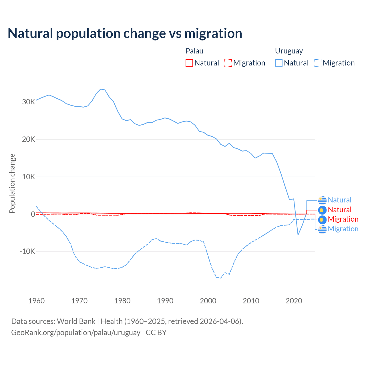 Over the last 10 years, 53.8% of the population change in Palau is from natural causes (a gain of 264 people) and 46.2% is from migration (a loss of 227 people). In Uruguay 70% is from natural causes (a gain of 64,303 people) and 30% is from migration (a loss of 27,501 people).