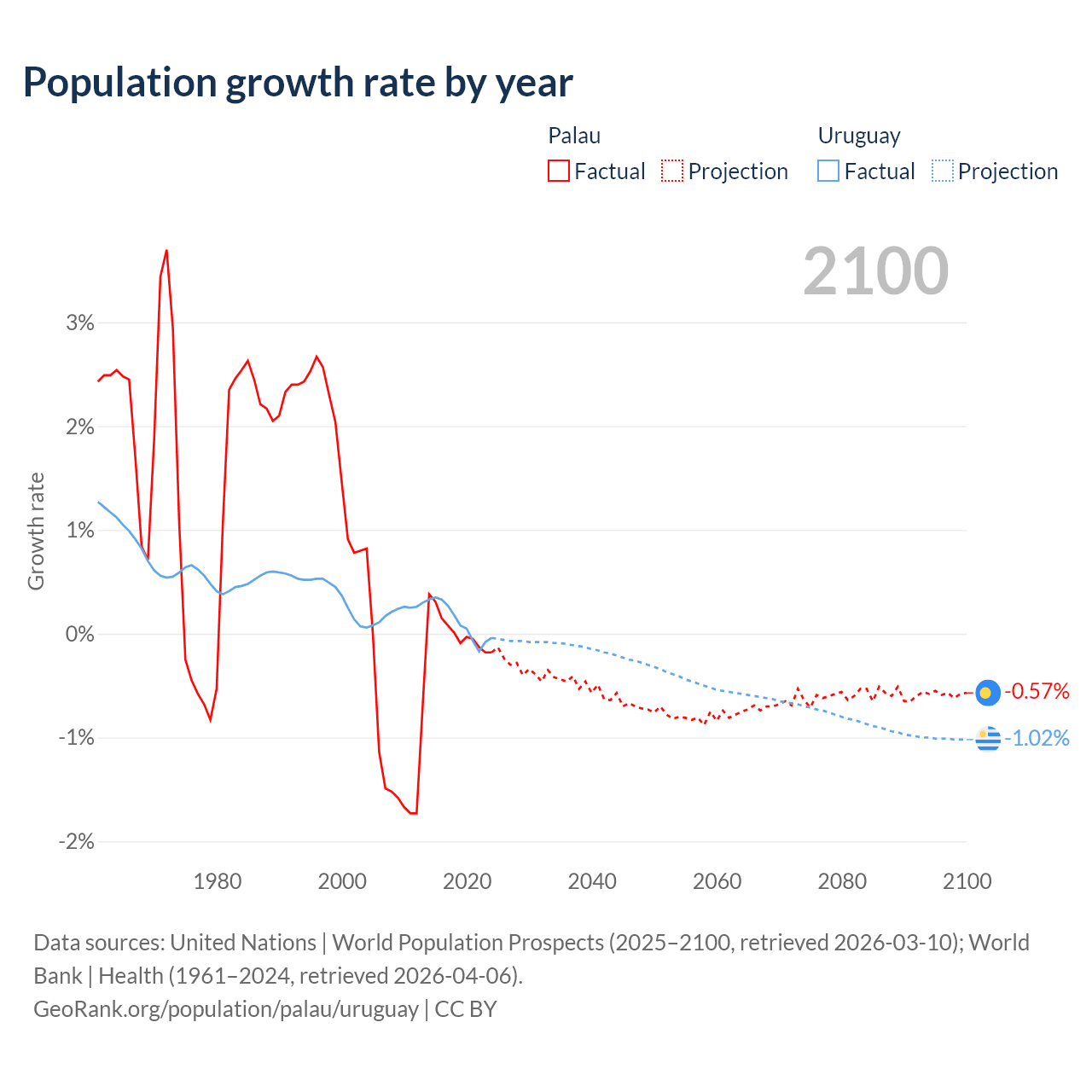 - For the last 10 years, Palau has had an average growth rate of +0.02% per year vs +0.11% in Uruguay.