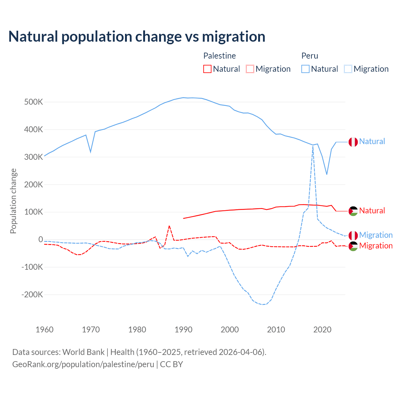 Over the last 10 years, 85.7% of the population change in Palestine is from natural causes (a gain of 1,218,010 people) and 14.3% is from migration (a loss of 202,820 people). In Peru 82% is from natural causes (a gain of 3,345,822 people) and 18% is from migration (a gain of 732,505 people).