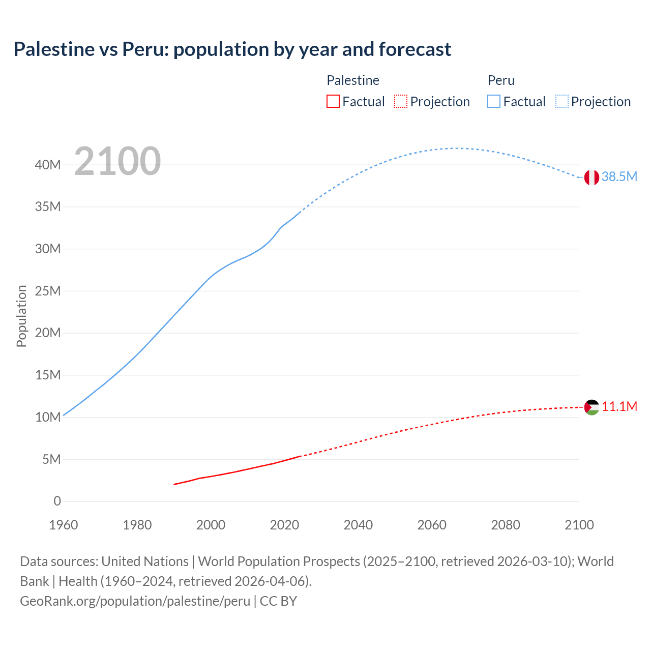 The latest officially reported population of Palestine was 5,289,152 in 2024 vs 34,217,848 people in Peru in 2024. In 2026, based on the adjusted UN estimation, the current Palestine's population is 5,500,288 people compared to 35,031,596 in Peru.