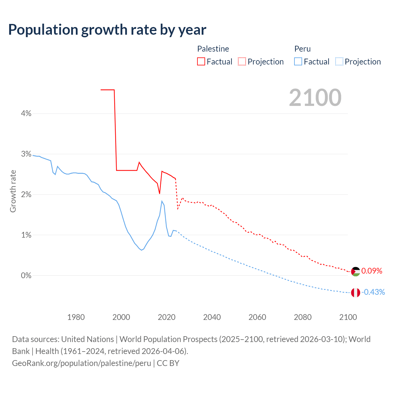 - For the last 10 years, Palestine has had an average growth rate of +2.4% per year vs +1.26% in Peru.