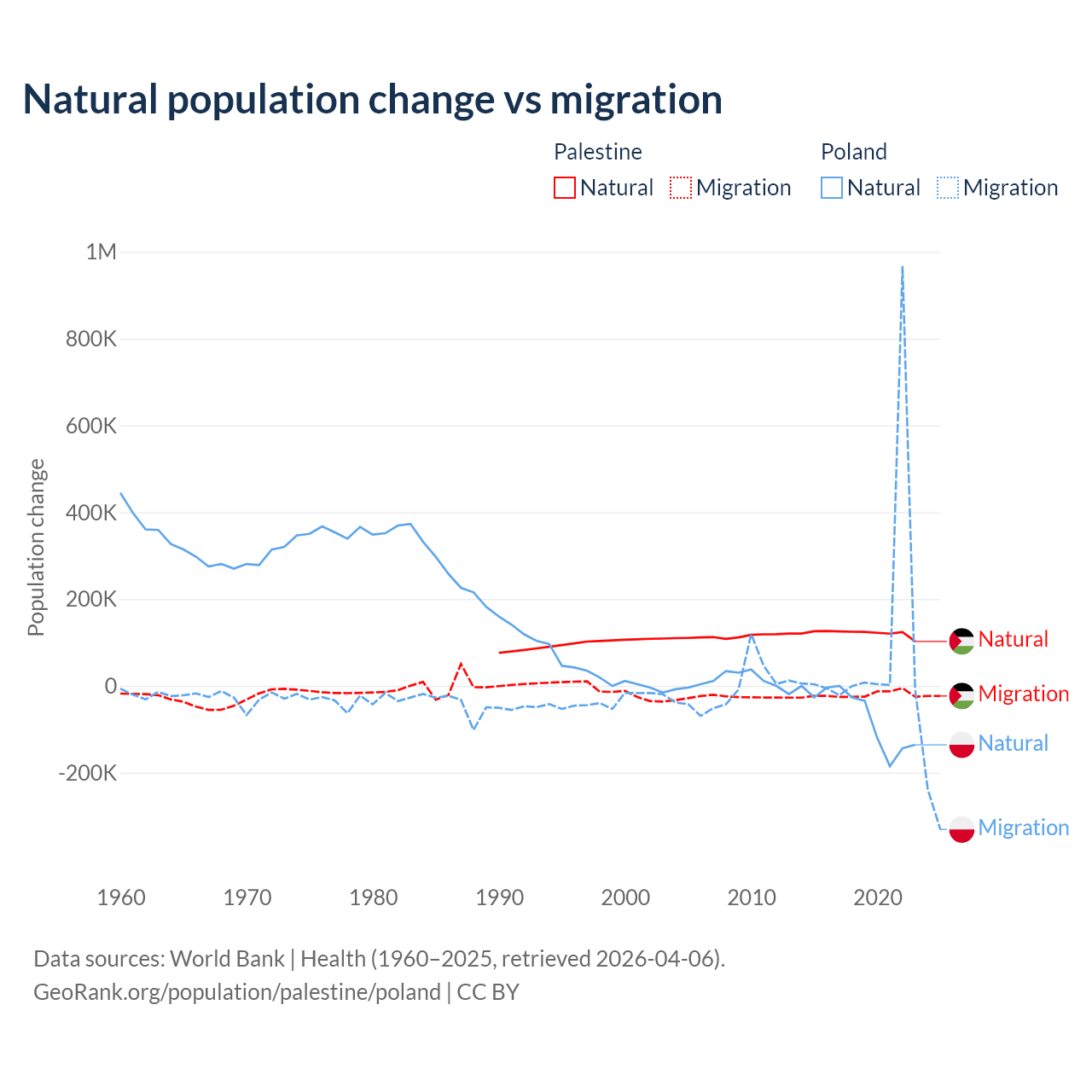 Over the last 10 years, 85.7% of the population change in Palestine is from natural causes (a gain of 1,218,010 people) and 14.3% is from migration (a loss of 202,820 people). In Poland 41.4% is from natural causes (a loss of 675,443 people) and 58.6% is from migration (a gain of 955,766 people).