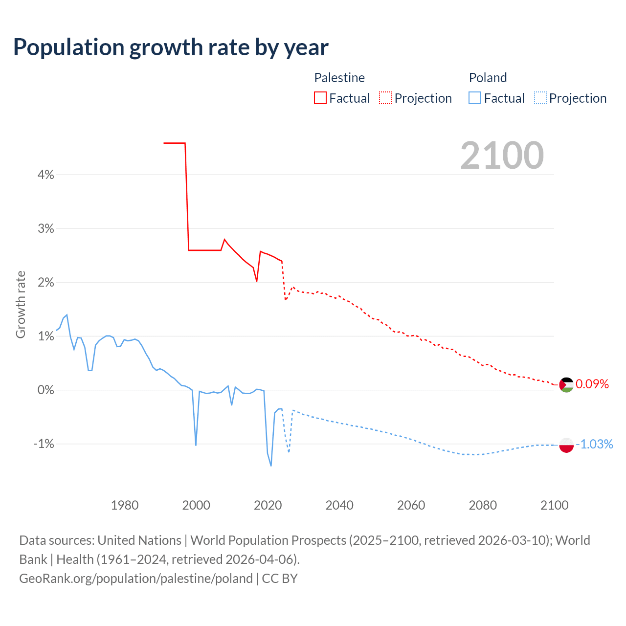 - For the last 10 years, Palestine has had an average growth rate of +2.4% per year vs -0.36% in Poland.