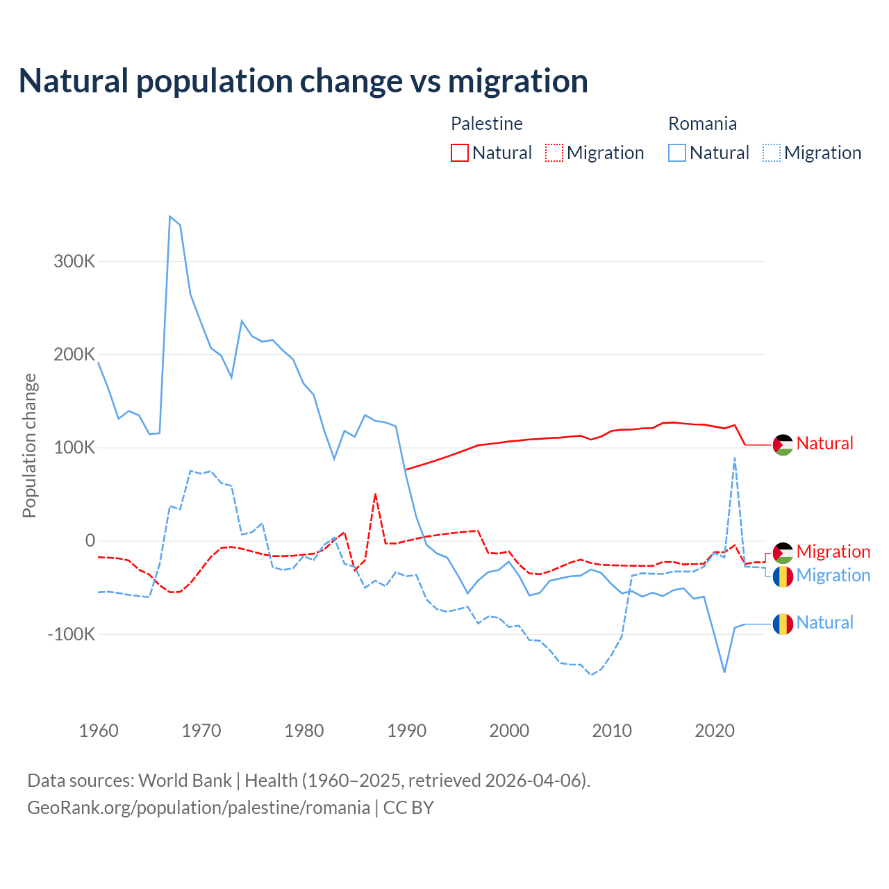 Over the last 10 years, 85.7% of the population change in Palestine is from natural causes (a gain of 1,218,010 people) and 14.3% is from migration (a loss of 202,820 people). In Romania 82% is from natural causes (a loss of 766,295 people) and 18% is from migration (a loss of 167,917 people).
