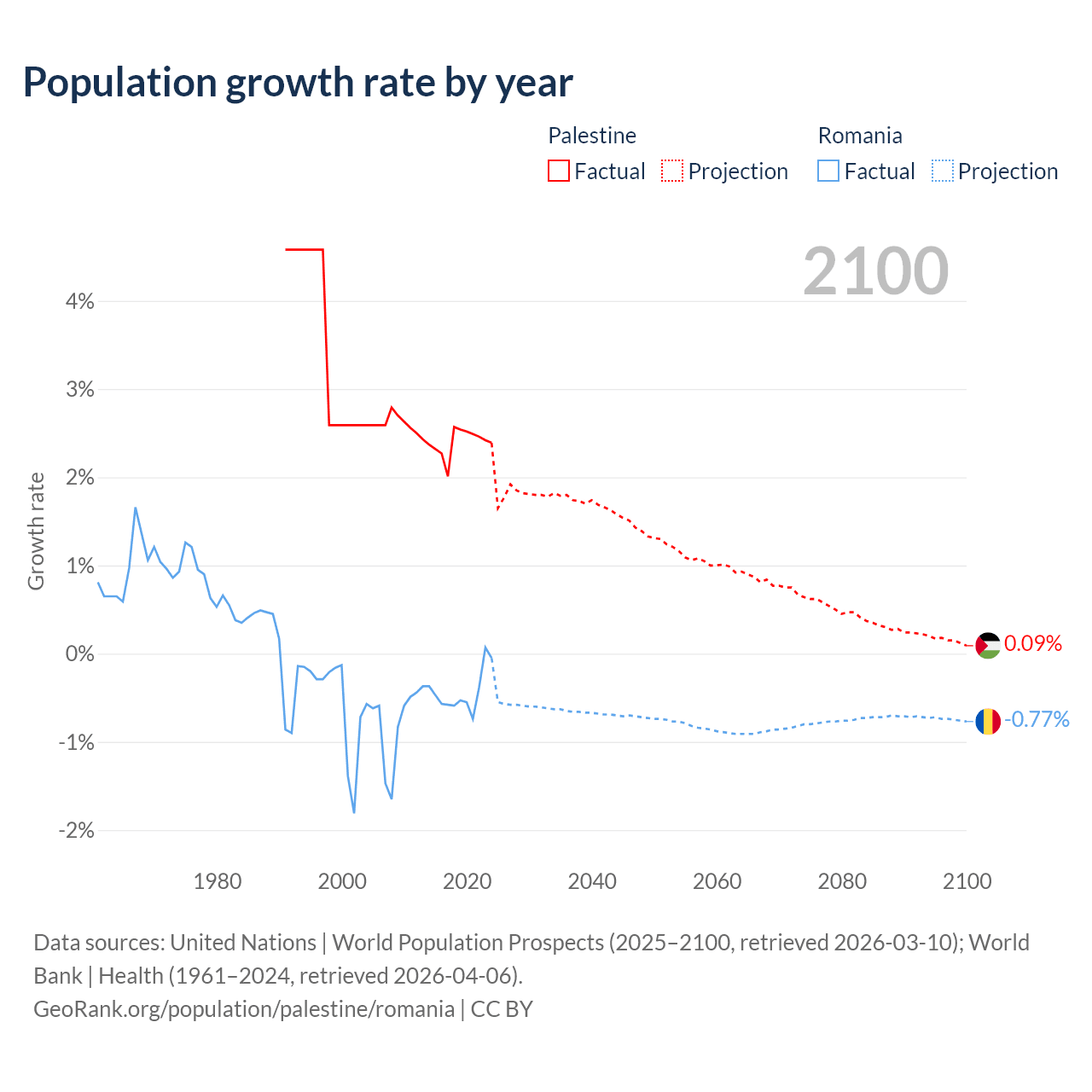 - For the last 10 years, Palestine has had an average growth rate of +2.4% per year vs -0.43% in Romania.