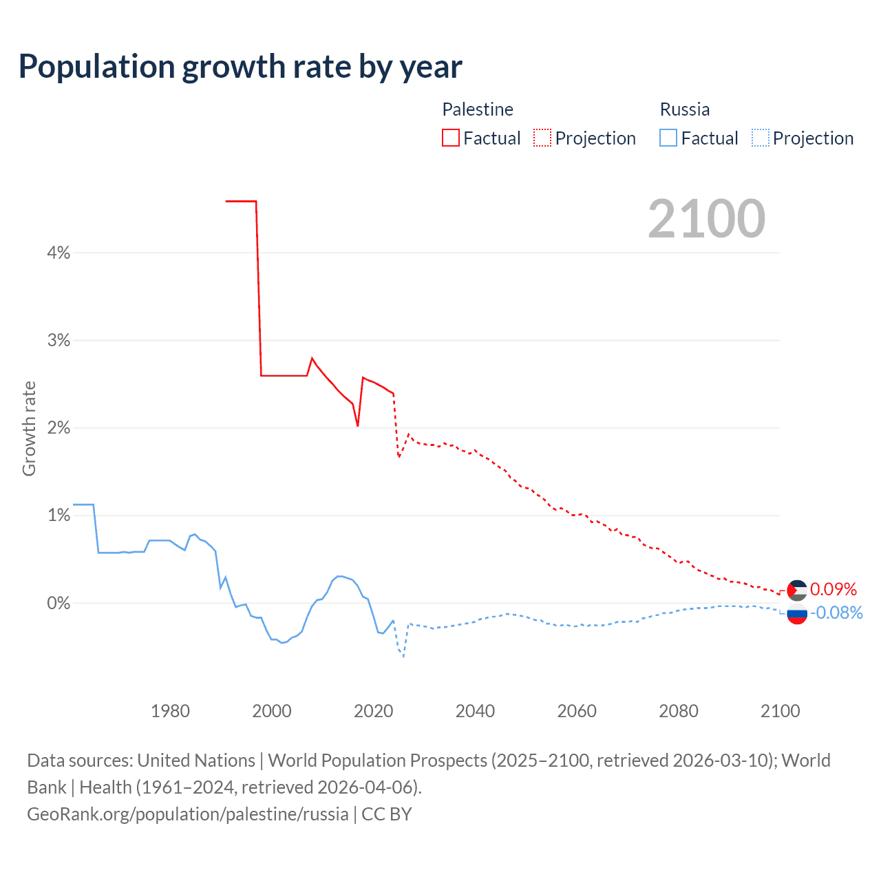 - For the last 10 years, Palestine has had an average growth rate of +2.4% per year vs -0.02% in Russia.